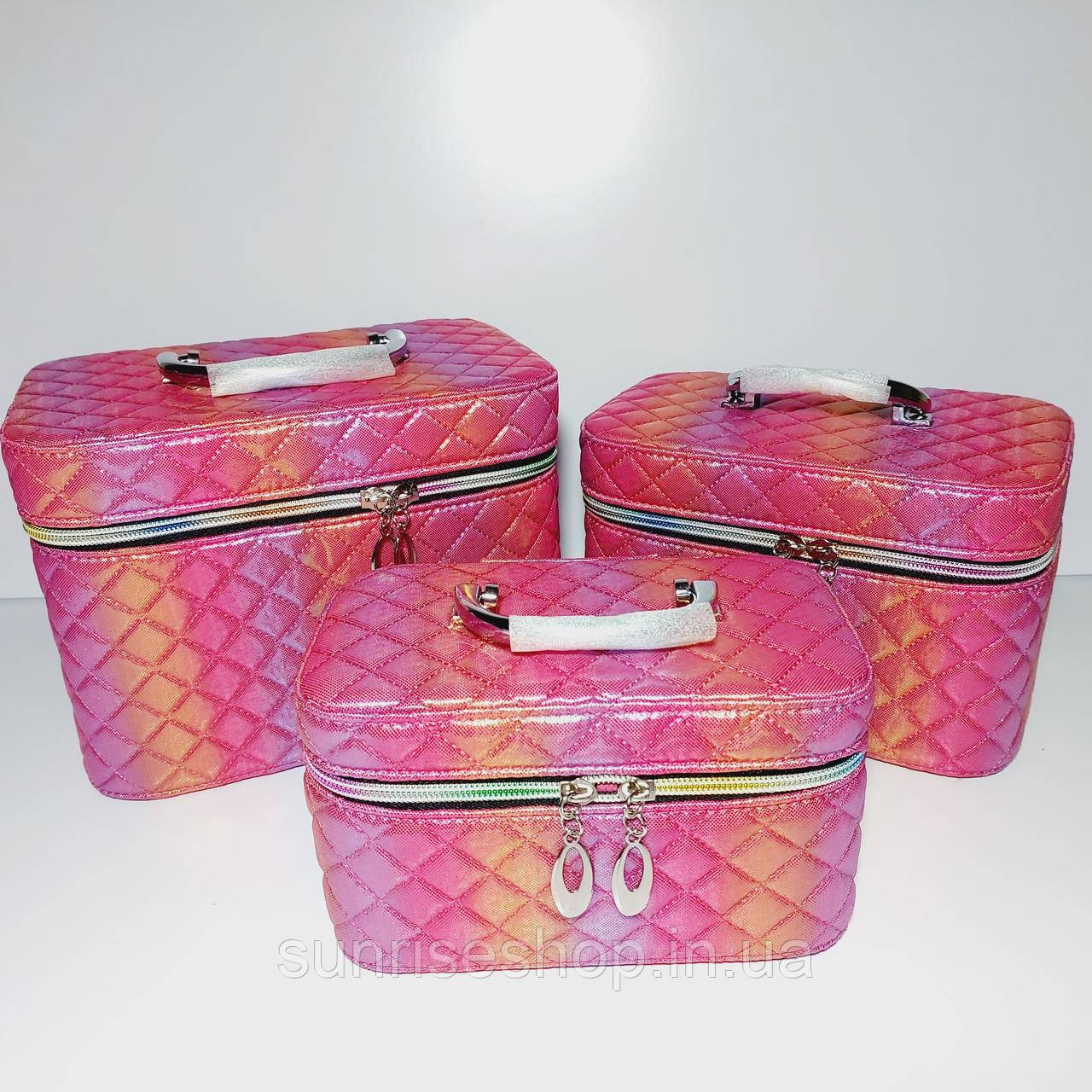 Набір з трьох косметичок з жесткими стінками та дзеркалом будуть прекрасним подарунком дівчинці та жінці. Приємний дізайн та зручна ручка придають більше функціональних можливостей боксу зі стильним малюнком. Цей набір може чудово поєднуватися з інтер'єром вашего дому, а може служити в дорозі для зберігання так необходних жінці речей.